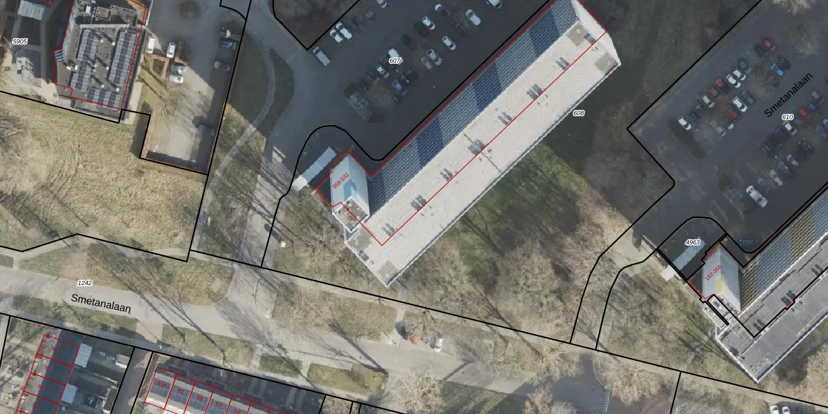 Het perceel waarop Smetanalaan 520 staat heeft een oppervlakte van 6946 m². Dit is een zeer groot perceel. De perceeloppervlakte wordt geregistreerd door het Kadaster. Gedetailleerde informatie over de maten van dit perceel kunt u vinden in het rapport Kadastrale kaart met maatvoering van Smetanalaan 520.