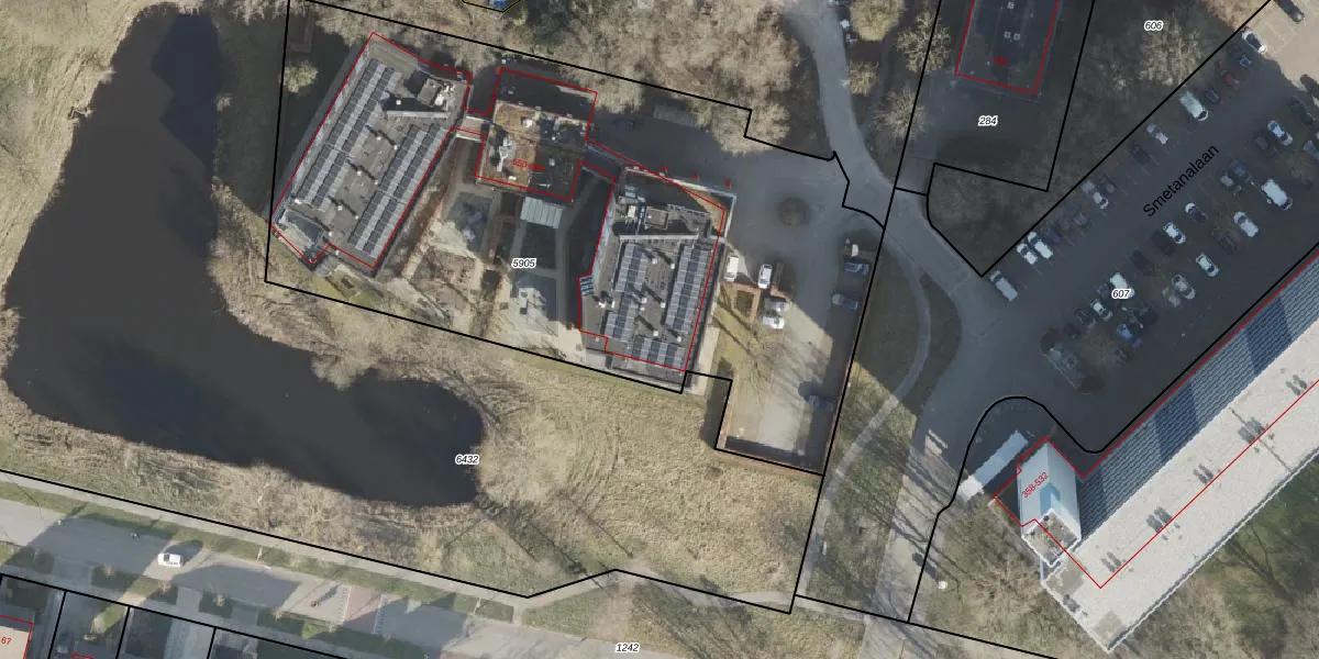 Het perceel waarop Smetanalaan 566 staat heeft een oppervlakte van 3995 m². Dit is een zeer groot perceel. De perceeloppervlakte wordt geregistreerd door het Kadaster. Gedetailleerde informatie over de maten van dit perceel kunt u vinden in het rapport Kadastrale kaart met maatvoering van Smetanalaan 566.