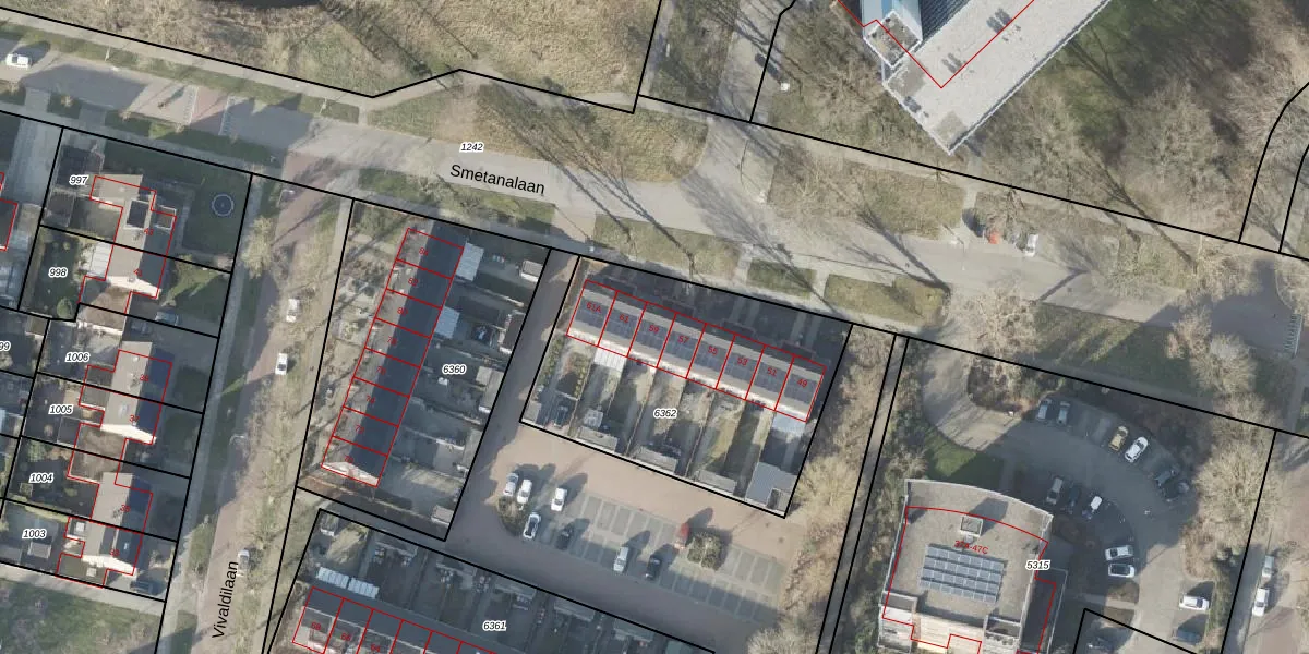Het perceel waarop Smetanalaan 59 staat heeft een oppervlakte van 1260 m². Dit is een zeer groot perceel. De perceeloppervlakte wordt geregistreerd door het Kadaster. Gedetailleerde informatie over de maten van dit perceel kunt u vinden in het rapport Kadastrale kaart met maatvoering van Smetanalaan 59.