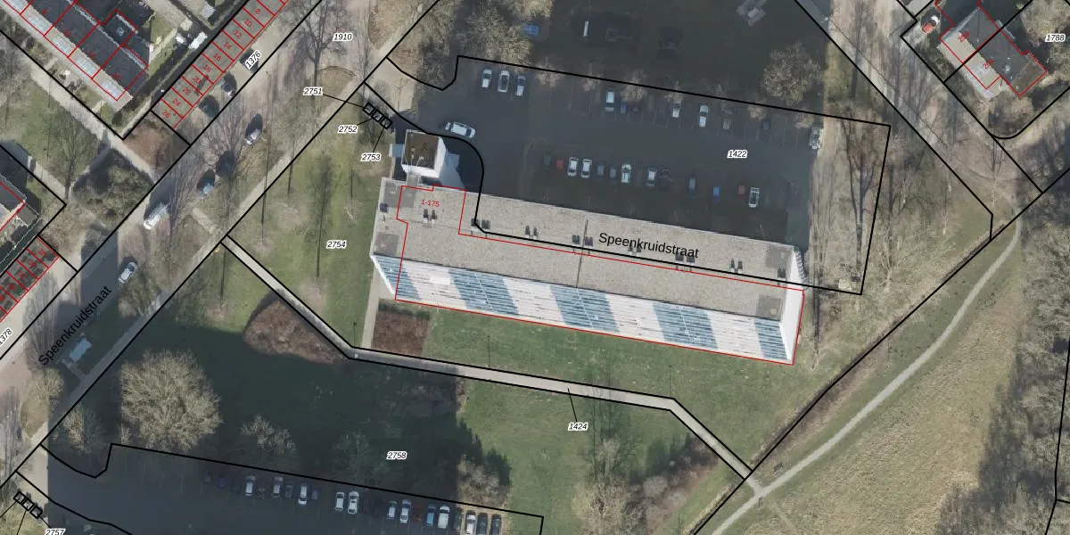 Het perceel waarop Speenkruidstraat 21 staat heeft een oppervlakte van 6539 m². Dit is een zeer groot perceel. De perceeloppervlakte wordt geregistreerd door het Kadaster. Gedetailleerde informatie over de maten van dit perceel kunt u vinden in het rapport Kadastrale kaart met maatvoering van Speenkruidstraat 21.