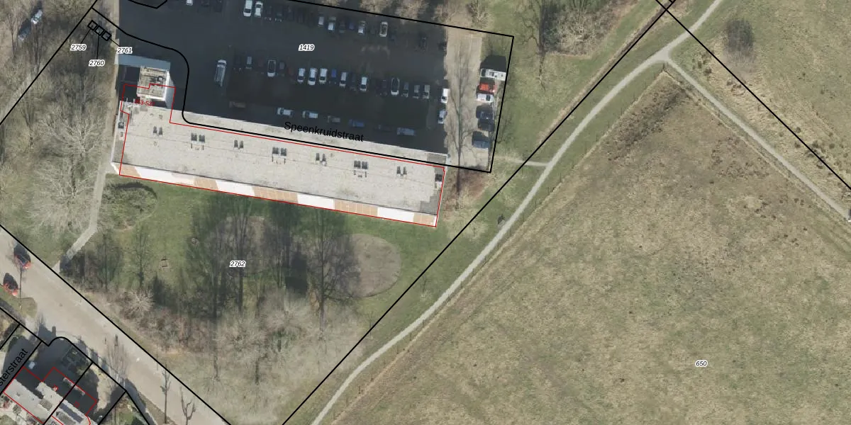 Het perceel waarop Speenkruidstraat 511 staat heeft een oppervlakte van 9544 m². Dit is een zeer groot perceel. De perceeloppervlakte wordt geregistreerd door het Kadaster. Gedetailleerde informatie over de maten van dit perceel kunt u vinden in het rapport Kadastrale kaart met maatvoering van Speenkruidstraat 511.