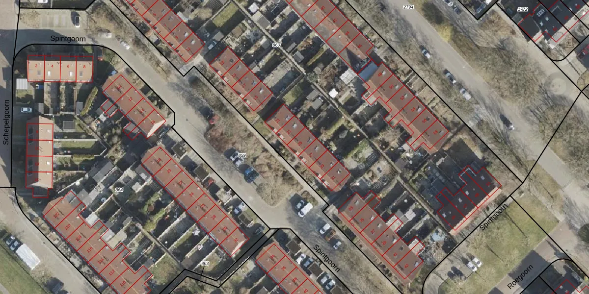 Het perceel waarop Spintgoorn 25 staat heeft een oppervlakte van 1,0 ha. Dit is een zeer groot perceel. De perceeloppervlakte wordt geregistreerd door het Kadaster. Gedetailleerde informatie over de maten van dit perceel kunt u vinden in het rapport Kadastrale kaart met maatvoering van Spintgoorn 25.