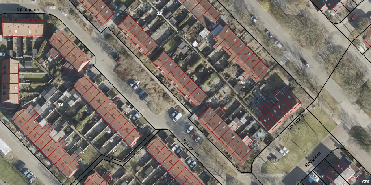 Het perceel waarop Spintgoorn 29 staat heeft een oppervlakte van 1,0 ha. Dit is een zeer groot perceel. De perceeloppervlakte wordt geregistreerd door het Kadaster. Gedetailleerde informatie over de maten van dit perceel kunt u vinden in het rapport Kadastrale kaart met maatvoering van Spintgoorn 29.