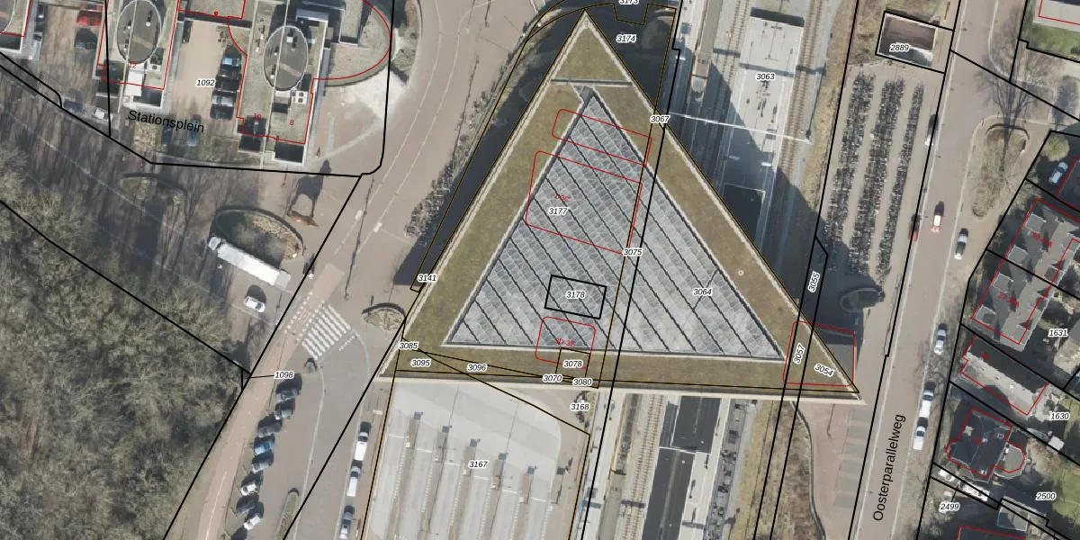 Het perceel waarop Stationsplein 3 staat heeft een oppervlakte van 1682 m². Dit is een zeer groot perceel. De perceeloppervlakte wordt geregistreerd door het Kadaster. Gedetailleerde informatie over de maten van dit perceel kunt u vinden in het rapport Kadastrale kaart met maatvoering van Stationsplein 3.