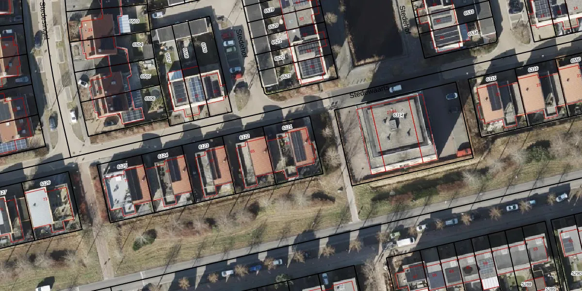 Het perceel waarop Stedewaarts 63 staat heeft een oppervlakte van 339 m². Dit is een groot perceel. De perceeloppervlakte wordt geregistreerd door het Kadaster. Gedetailleerde informatie over de maten van dit perceel kunt u vinden in het rapport Kadastrale kaart met maatvoering van Stedewaarts 63.