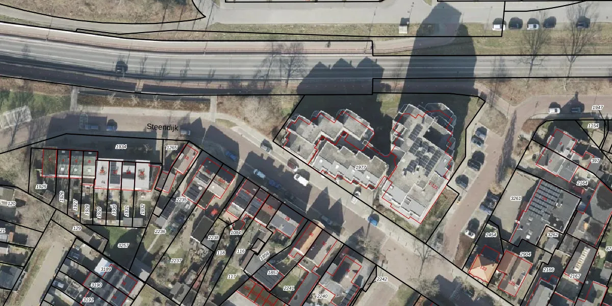 Het perceel waarop Steendijk 15 staat heeft een oppervlakte van 2050 m². Dit is een zeer groot perceel. De perceeloppervlakte wordt geregistreerd door het Kadaster. Gedetailleerde informatie over de maten van dit perceel kunt u vinden in het rapport Kadastrale kaart met maatvoering van Steendijk 15.