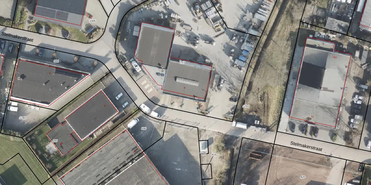 Het perceel waarop Stelmakerstraat 9 staat heeft een oppervlakte van 3827 m². Dit is een zeer groot perceel. De perceeloppervlakte wordt geregistreerd door het Kadaster. Gedetailleerde informatie over de maten van dit perceel kunt u vinden in het rapport Kadastrale kaart met maatvoering van Stelmakerstraat 9.
