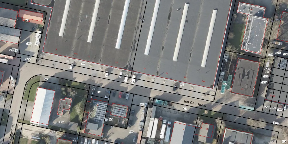 Het perceel waarop ten Catestraat 15 staat heeft een oppervlakte van 4657 m². Dit is een zeer groot perceel. De perceeloppervlakte wordt geregistreerd door het Kadaster. Gedetailleerde informatie over de maten van dit perceel kunt u vinden in het rapport Kadastrale kaart met maatvoering van ten Catestraat 15.