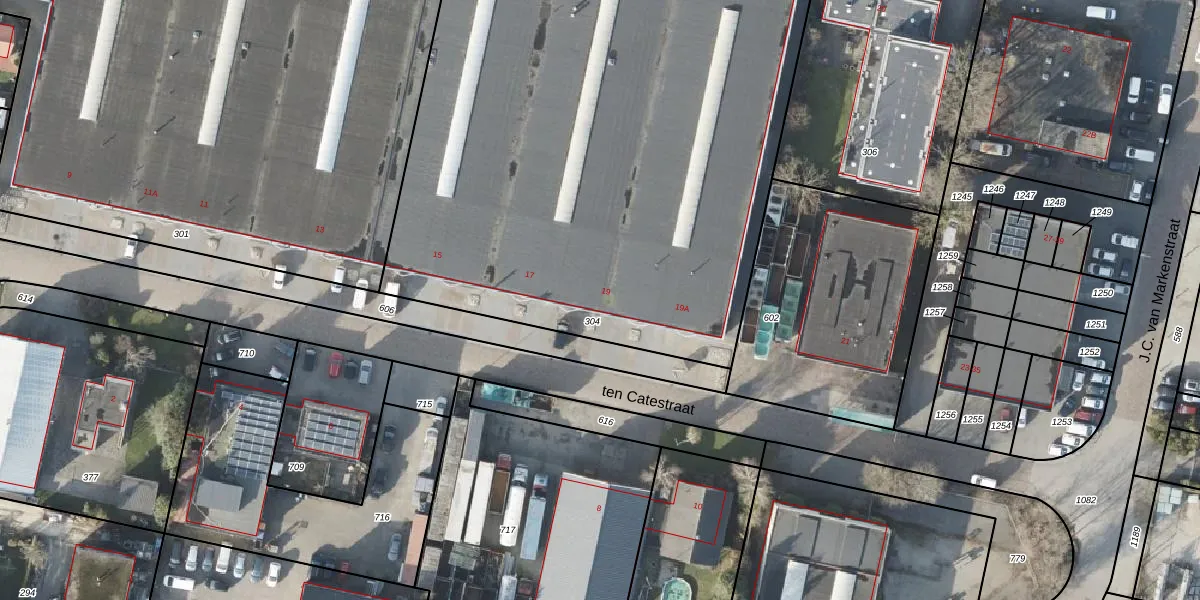 Het perceel waarop ten Catestraat 19 staat heeft een oppervlakte van 4657 m². Dit is een zeer groot perceel. De perceeloppervlakte wordt geregistreerd door het Kadaster. Gedetailleerde informatie over de maten van dit perceel kunt u vinden in het rapport Kadastrale kaart met maatvoering van ten Catestraat 19.