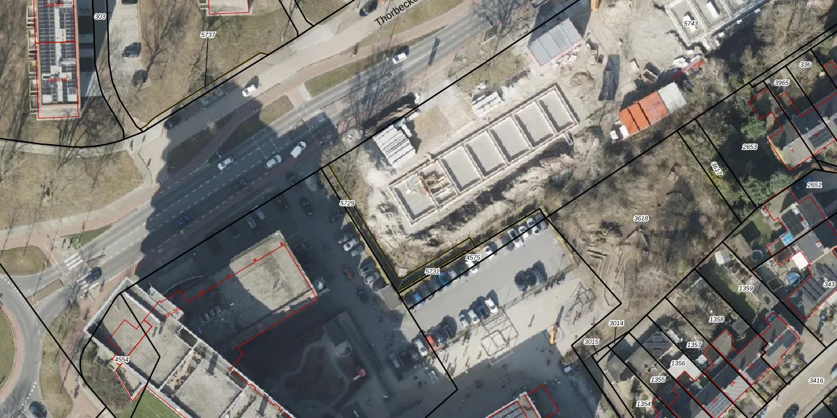 Het perceel waarop Thorbeckelaan 123-E staat heeft een oppervlakte van 5824 m². Dit is een zeer groot perceel. De perceeloppervlakte wordt geregistreerd door het Kadaster. Gedetailleerde informatie over de maten van dit perceel kunt u vinden in het rapport Kadastrale kaart met maatvoering van Thorbeckelaan 123-E.