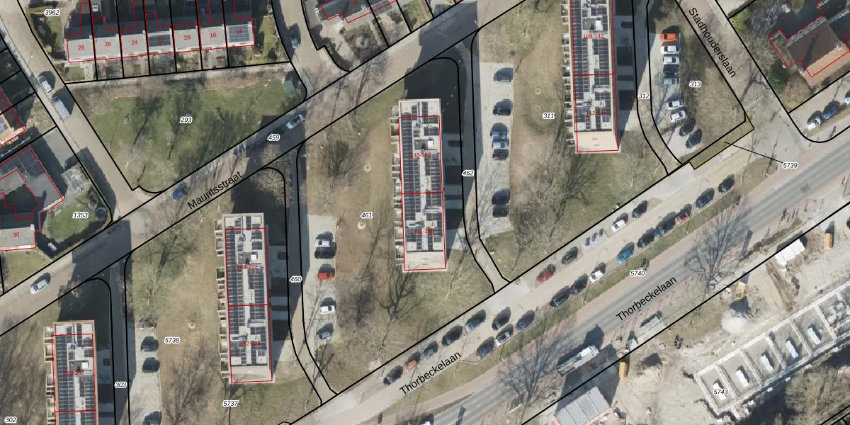 Het perceel waarop Thorbeckelaan 168 staat heeft een oppervlakte van 2433 m². Dit is een zeer groot perceel. De perceeloppervlakte wordt geregistreerd door het Kadaster. Gedetailleerde informatie over de maten van dit perceel kunt u vinden in het rapport Kadastrale kaart met maatvoering van Thorbeckelaan 168.