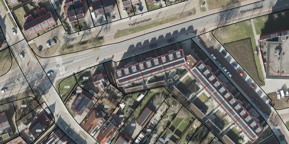 Het perceel waarop Thorbeckelaan 29-D staat heeft een oppervlakte van 3880 m². Dit is een zeer groot perceel. De perceeloppervlakte wordt geregistreerd door het Kadaster. Gedetailleerde informatie over de maten van dit perceel kunt u vinden in het rapport Kadastrale kaart met maatvoering van Thorbeckelaan 29-D.