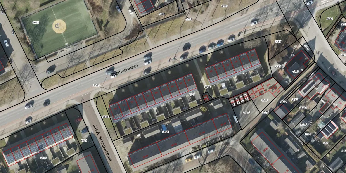 Het perceel waarop Thorbeckelaan 65 staat heeft een oppervlakte van 2559 m². Dit is een zeer groot perceel. De perceeloppervlakte wordt geregistreerd door het Kadaster. Gedetailleerde informatie over de maten van dit perceel kunt u vinden in het rapport Kadastrale kaart met maatvoering van Thorbeckelaan 65.