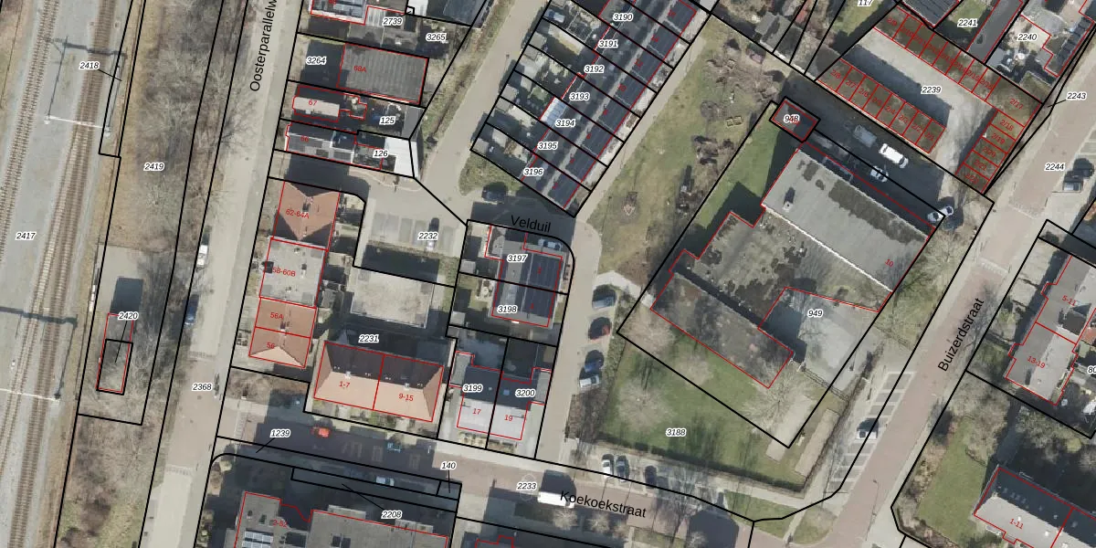 Gebruik de zoekbalk of klik op een perceel voor informatie over de adressen binnen dit perceel.