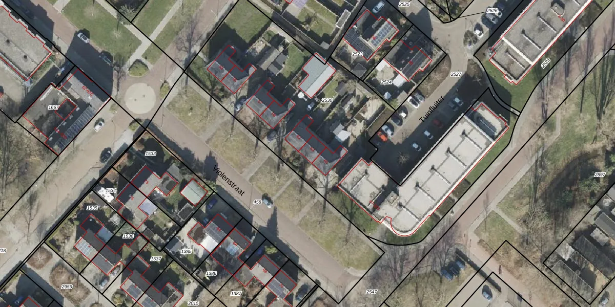 Het perceel waarop Violenstraat 63 staat heeft een oppervlakte van 3409 m². Dit is een zeer groot perceel. De perceeloppervlakte wordt geregistreerd door het Kadaster. Gedetailleerde informatie over de maten van dit perceel kunt u vinden in het rapport Kadastrale kaart met maatvoering van Violenstraat 63.