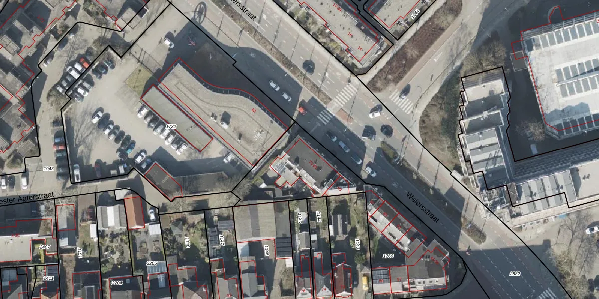 Het perceel waarop Weiersstraat 79 staat heeft een oppervlakte van 1484 m². Dit is een zeer groot perceel. De perceeloppervlakte wordt geregistreerd door het Kadaster. Gedetailleerde informatie over de maten van dit perceel kunt u vinden in het rapport Kadastrale kaart met maatvoering van Weiersstraat 79.