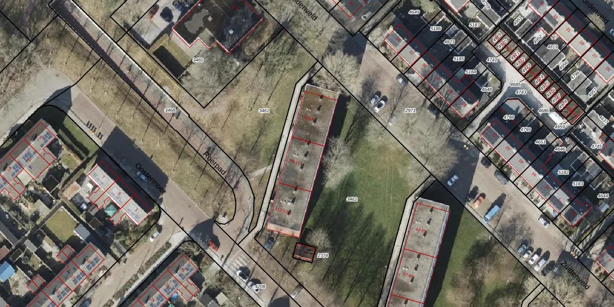 Het perceel waarop Zuidenveld 107 staat heeft een oppervlakte van 2694 m². Dit is een zeer groot perceel. De perceeloppervlakte wordt geregistreerd door het Kadaster. Gedetailleerde informatie over de maten van dit perceel kunt u vinden in het rapport Kadastrale kaart met maatvoering van Zuidenveld 107.