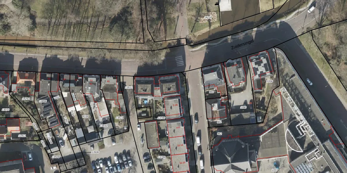 Het perceel waarop Zuidersingel 33 staat heeft een oppervlakte van 1800 m². Dit is een zeer groot perceel. De perceeloppervlakte wordt geregistreerd door het Kadaster. Gedetailleerde informatie over de maten van dit perceel kunt u vinden in het rapport Kadastrale kaart met maatvoering van Zuidersingel 33.