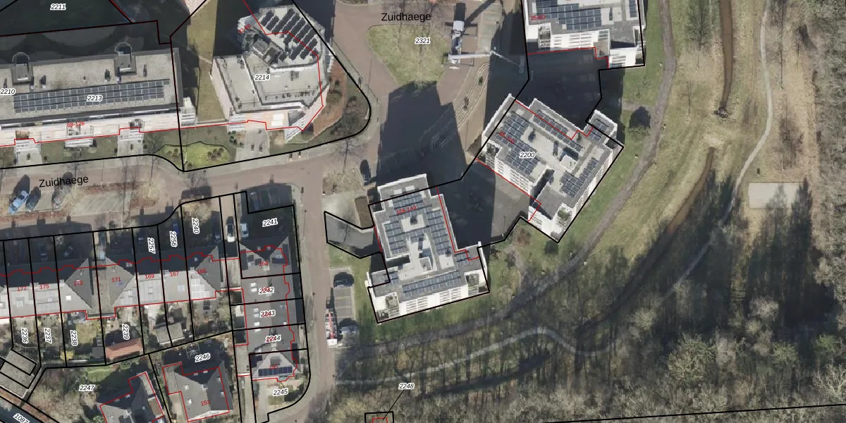 Het perceel waarop Zuidhaege 119 staat heeft een oppervlakte van 2347 m². Dit is een zeer groot perceel. De perceeloppervlakte wordt geregistreerd door het Kadaster. Gedetailleerde informatie over de maten van dit perceel kunt u vinden in het rapport Kadastrale kaart met maatvoering van Zuidhaege 119.