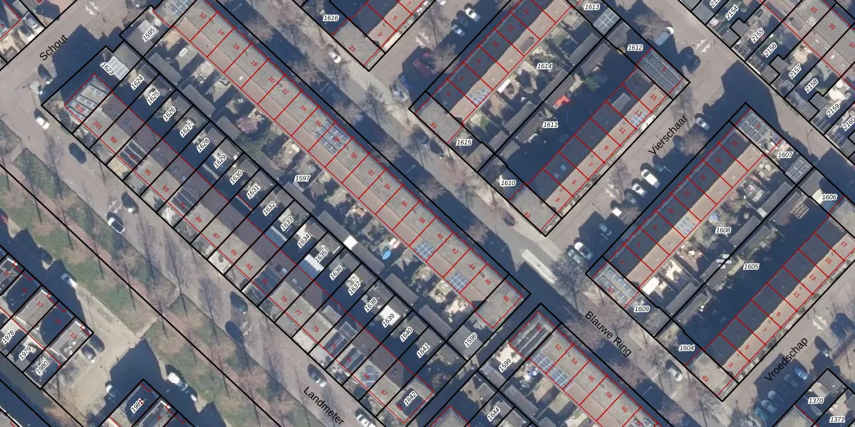 Het perceel waarop Blauwe Ring 38 staat heeft een oppervlakte van 2111 m². Dit is een zeer groot perceel. De perceeloppervlakte wordt geregistreerd door het Kadaster. Gedetailleerde informatie over de maten van dit perceel kunt u vinden in het rapport Kadastrale kaart met maatvoering van Blauwe Ring 38.