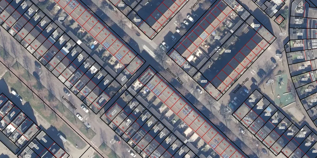 Het perceel waarop Blauwe Ring 52 staat heeft een oppervlakte van 1993 m². Dit is een zeer groot perceel. De perceeloppervlakte wordt geregistreerd door het Kadaster. Gedetailleerde informatie over de maten van dit perceel kunt u vinden in het rapport Kadastrale kaart met maatvoering van Blauwe Ring 52.
