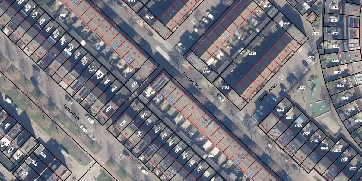 Het perceel waarop Blauwe Ring 54 staat heeft een oppervlakte van 1993 m². Dit is een zeer groot perceel. De perceeloppervlakte wordt geregistreerd door het Kadaster. Gedetailleerde informatie over de maten van dit perceel kunt u vinden in het rapport Kadastrale kaart met maatvoering van Blauwe Ring 54.