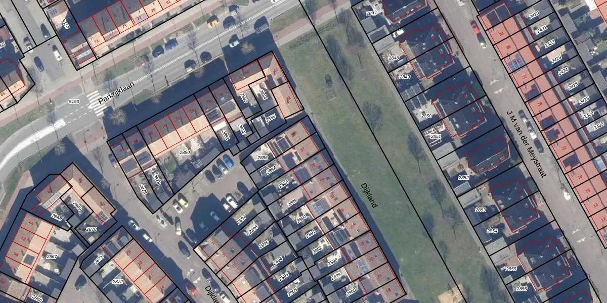 Het perceel waarop Dijkland 37 staat heeft een oppervlakte van 157 m². Dit is een middelgroot perceel. De perceeloppervlakte wordt geregistreerd door het Kadaster. Gedetailleerde informatie over de maten van dit perceel kunt u vinden in het rapport Kadastrale kaart met maatvoering van Dijkland 37.