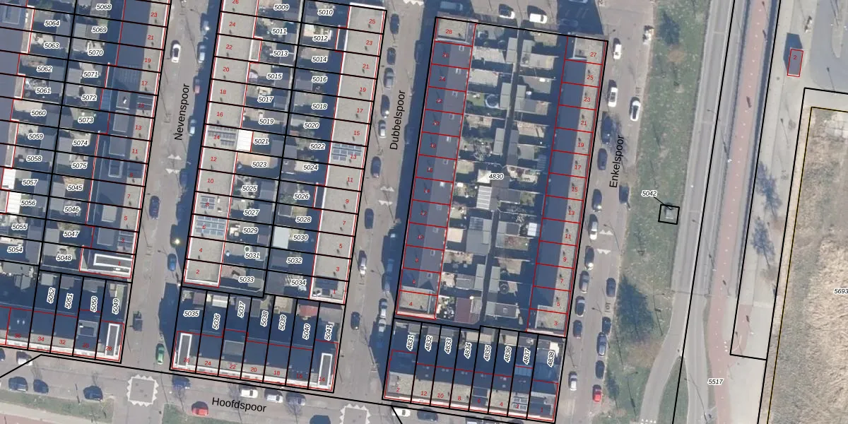 Het perceel waarop Dubbelspoor 12 staat heeft een oppervlakte van 2878 m². Dit is een zeer groot perceel. De perceeloppervlakte wordt geregistreerd door het Kadaster. Gedetailleerde informatie over de maten van dit perceel kunt u vinden in het rapport Kadastrale kaart met maatvoering van Dubbelspoor 12.