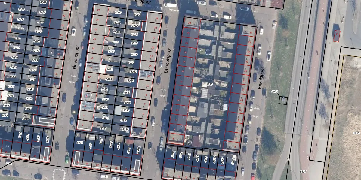 Het perceel waarop Dubbelspoor 14 staat heeft een oppervlakte van 2878 m². Dit is een zeer groot perceel. De perceeloppervlakte wordt geregistreerd door het Kadaster. Gedetailleerde informatie over de maten van dit perceel kunt u vinden in het rapport Kadastrale kaart met maatvoering van Dubbelspoor 14.