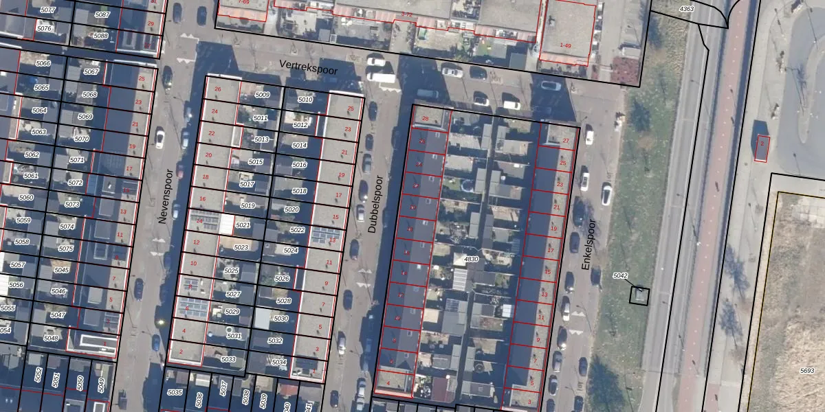 Het perceel waarop Dubbelspoor 20 staat heeft een oppervlakte van 2878 m². Dit is een zeer groot perceel. De perceeloppervlakte wordt geregistreerd door het Kadaster. Gedetailleerde informatie over de maten van dit perceel kunt u vinden in het rapport Kadastrale kaart met maatvoering van Dubbelspoor 20.