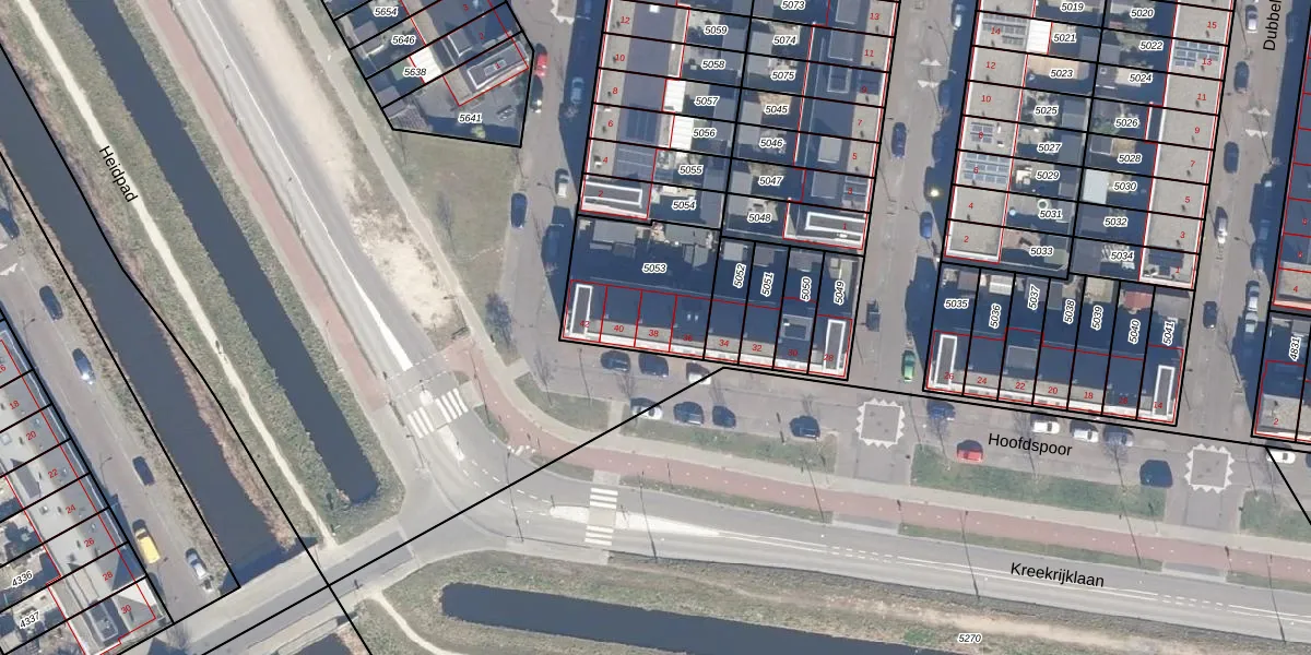 Het perceel waarop Hoofdspoor 38 staat heeft een oppervlakte van 436 m². Dit is een groot perceel. De perceeloppervlakte wordt geregistreerd door het Kadaster. Gedetailleerde informatie over de maten van dit perceel kunt u vinden in het rapport Kadastrale kaart met maatvoering van Hoofdspoor 38.