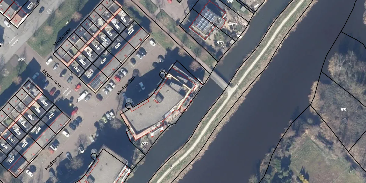 Het perceel waarop Mediterraan 35 staat heeft een oppervlakte van 1001 m². Dit is een zeer groot perceel. De perceeloppervlakte wordt geregistreerd door het Kadaster. Gedetailleerde informatie over de maten van dit perceel kunt u vinden in het rapport Kadastrale kaart met maatvoering van Mediterraan 35.