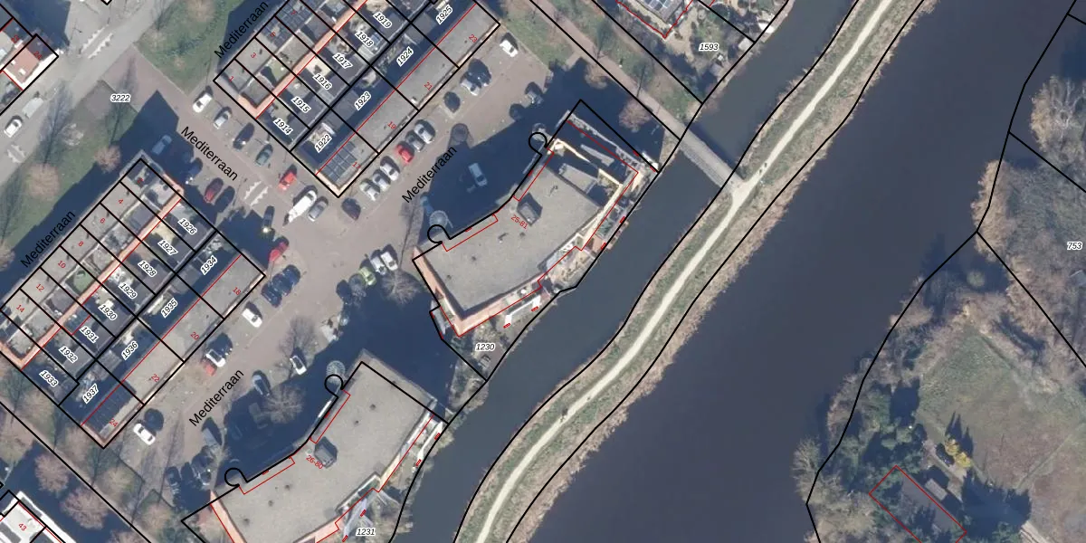 Het perceel waarop Mediterraan 61 staat heeft een oppervlakte van 1001 m². Dit is een zeer groot perceel. De perceeloppervlakte wordt geregistreerd door het Kadaster. Gedetailleerde informatie over de maten van dit perceel kunt u vinden in het rapport Kadastrale kaart met maatvoering van Mediterraan 61.