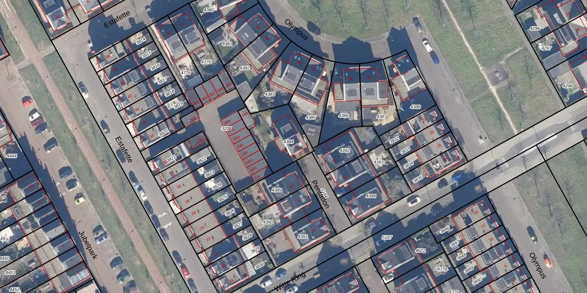 Het perceel waarop Pentatlon 15 staat heeft een oppervlakte van 334 m². Dit is een groot perceel. De perceeloppervlakte wordt geregistreerd door het Kadaster. Gedetailleerde informatie over de maten van dit perceel kunt u vinden in het rapport Kadastrale kaart met maatvoering van Pentatlon 15.