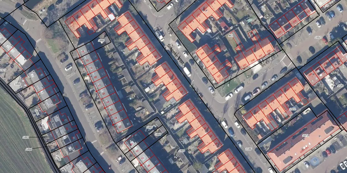 Het perceel waarop Smeeke Ven 60 staat heeft een oppervlakte van 9555 m². Dit is een zeer groot perceel. De perceeloppervlakte wordt geregistreerd door het Kadaster. Gedetailleerde informatie over de maten van dit perceel kunt u vinden in het rapport Kadastrale kaart met maatvoering van Smeeke Ven 60.