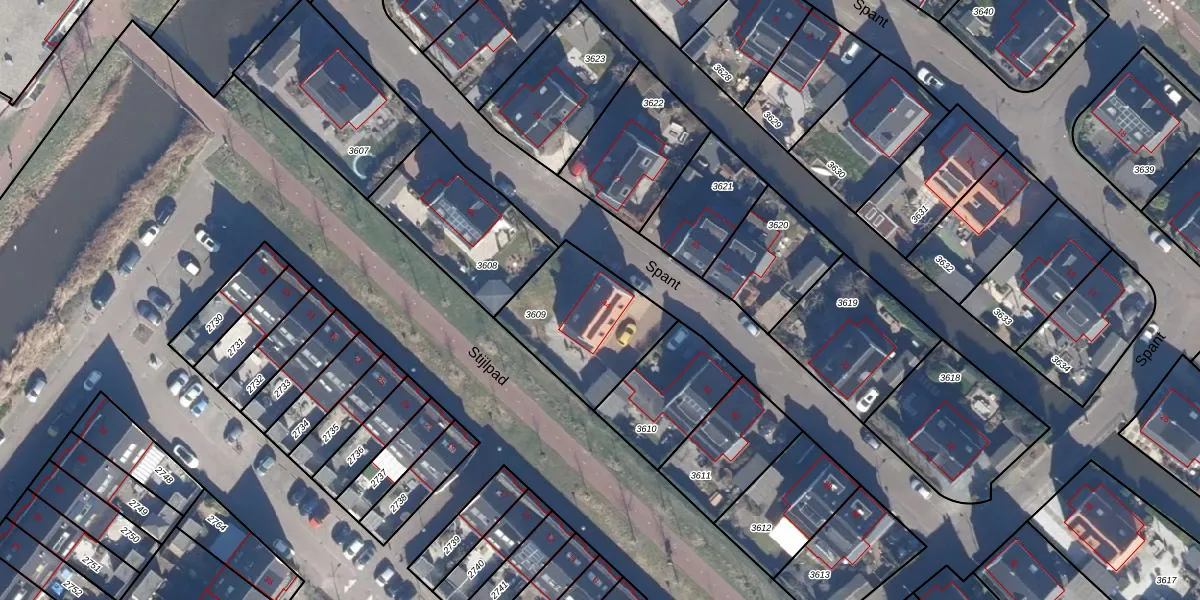 Het perceel waarop Spant 44 staat heeft een oppervlakte van 438 m². Dit is een groot perceel. De perceeloppervlakte wordt geregistreerd door het Kadaster. Gedetailleerde informatie over de maten van dit perceel kunt u vinden in het rapport Kadastrale kaart met maatvoering van Spant 44.