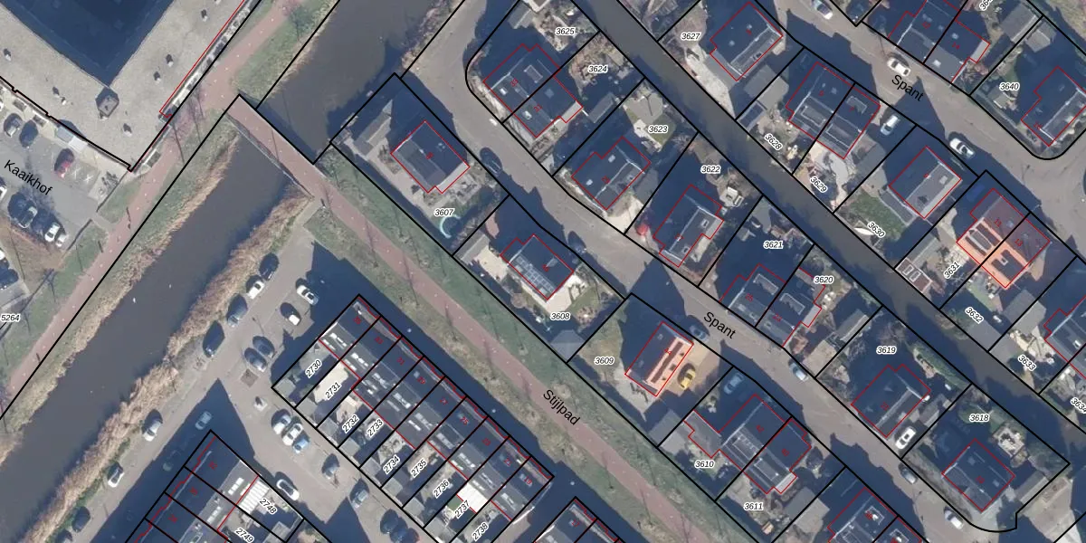 Het perceel waarop Spant 46 staat heeft een oppervlakte van 453 m². Dit is een groot perceel. De perceeloppervlakte wordt geregistreerd door het Kadaster. Gedetailleerde informatie over de maten van dit perceel kunt u vinden in het rapport Kadastrale kaart met maatvoering van Spant 46.