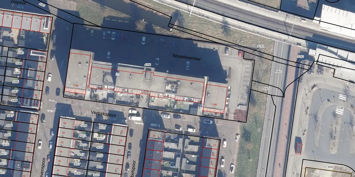 Het perceel waarop Vertrekspoor 26 staat heeft een oppervlakte van 4360 m². Dit is een zeer groot perceel. De perceeloppervlakte wordt geregistreerd door het Kadaster. Gedetailleerde informatie over de maten van dit perceel kunt u vinden in het rapport Kadastrale kaart met maatvoering van Vertrekspoor 26.