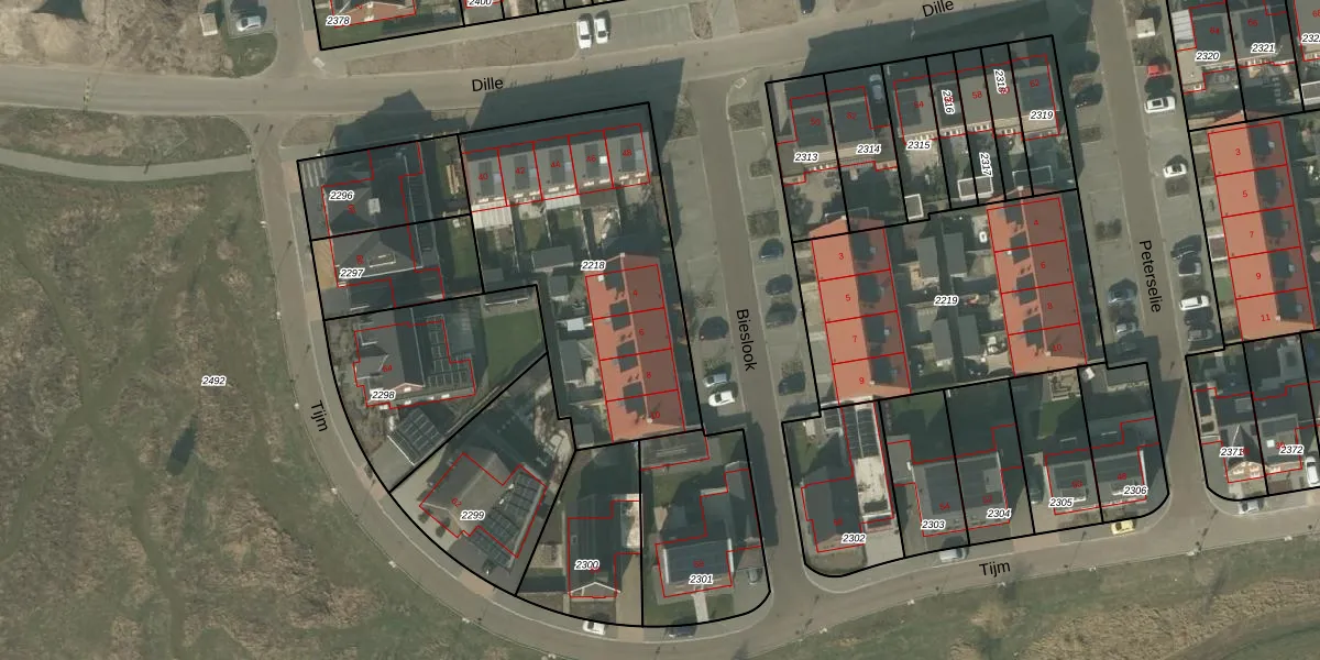 Het perceel waarop Bieslook 6 staat heeft een oppervlakte van 1257 m². Dit is een zeer groot perceel. De perceeloppervlakte wordt geregistreerd door het Kadaster. Gedetailleerde informatie over de maten van dit perceel kunt u vinden in het rapport Kadastrale kaart met maatvoering van Bieslook 6.