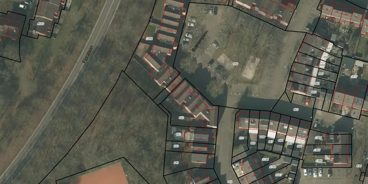 Het perceel waarop Boletenplein 14 staat heeft een oppervlakte van 530 m². Dit is een groot perceel. De perceeloppervlakte wordt geregistreerd door het Kadaster. Gedetailleerde informatie over de maten van dit perceel kunt u vinden in het rapport Kadastrale kaart met maatvoering van Boletenplein 14.