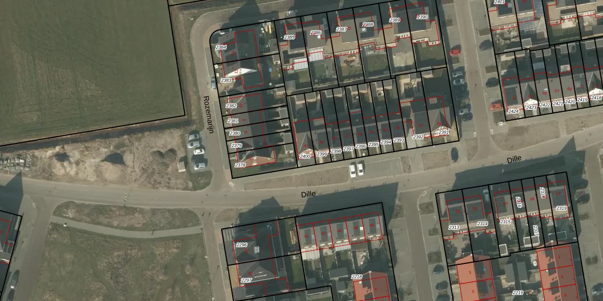 Het perceel waarop Dille 41 staat heeft een oppervlakte van 148 m². Dit is een middelgroot perceel. De perceeloppervlakte wordt geregistreerd door het Kadaster. Gedetailleerde informatie over de maten van dit perceel kunt u vinden in het rapport Kadastrale kaart met maatvoering van Dille 41.