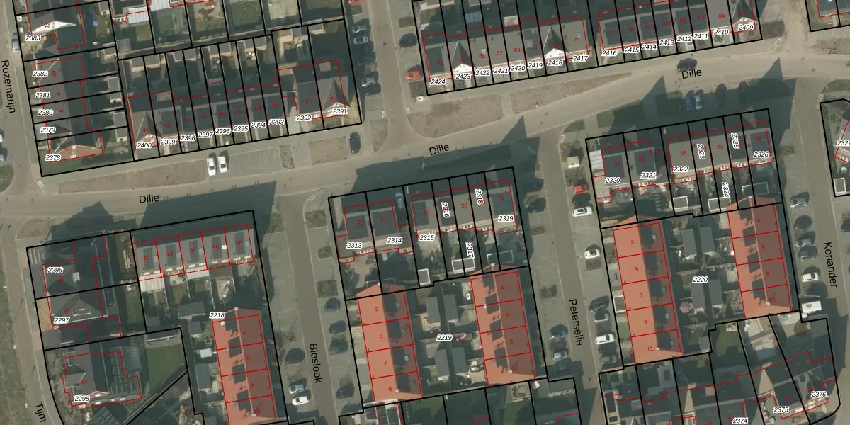 Het perceel waarop Dille 54 staat heeft een oppervlakte van 164 m². Dit is een middelgroot perceel. De perceeloppervlakte wordt geregistreerd door het Kadaster. Gedetailleerde informatie over de maten van dit perceel kunt u vinden in het rapport Kadastrale kaart met maatvoering van Dille 54.