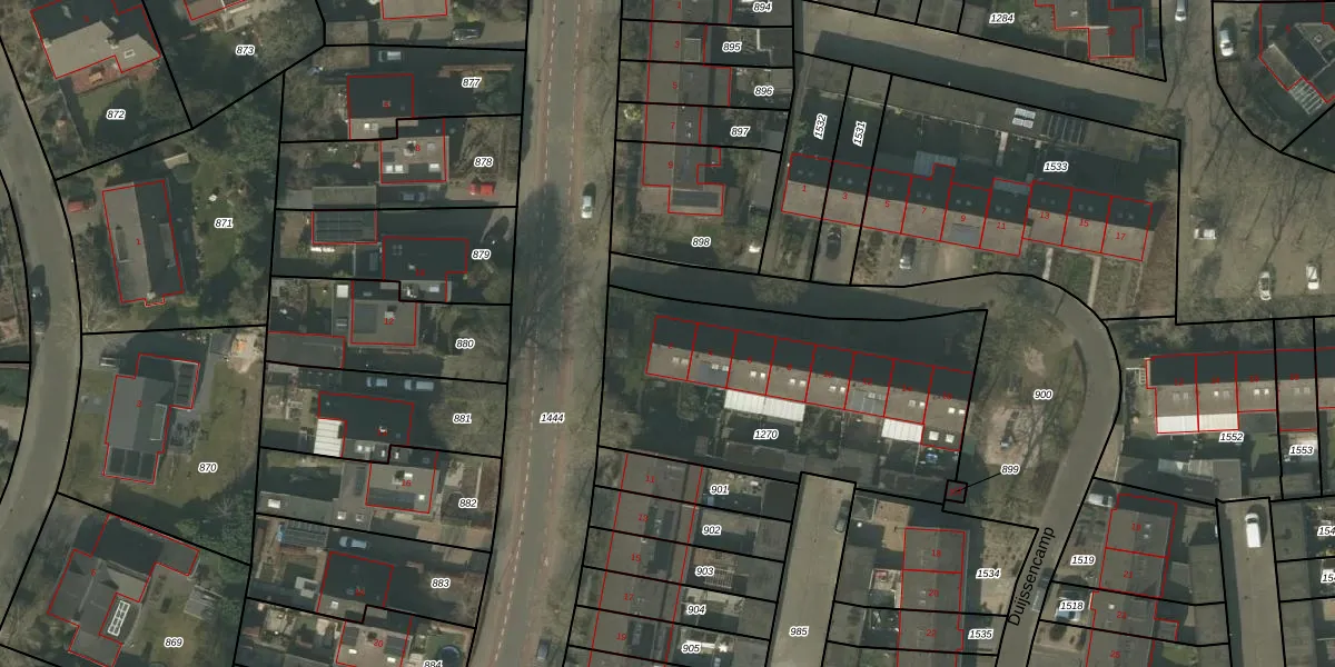 Het perceel waarop Duijssencamp 2 staat heeft een oppervlakte van 1373 m². Dit is een zeer groot perceel. De perceeloppervlakte wordt geregistreerd door het Kadaster. Gedetailleerde informatie over de maten van dit perceel kunt u vinden in het rapport Kadastrale kaart met maatvoering van Duijssencamp 2.