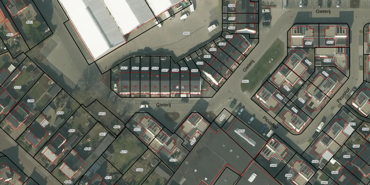 Het perceel waarop Gieterij 24 staat heeft een oppervlakte van 104 m². Dit is een middelgroot perceel. De perceeloppervlakte wordt geregistreerd door het Kadaster. Gedetailleerde informatie over de maten van dit perceel kunt u vinden in het rapport Kadastrale kaart met maatvoering van Gieterij 24.