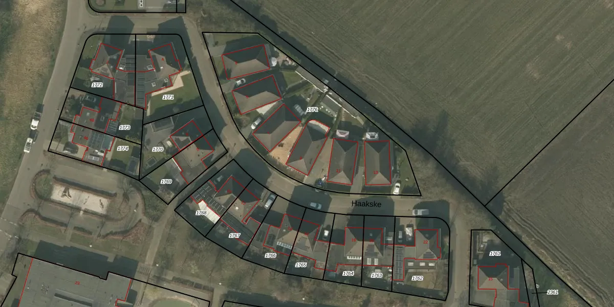 Het perceel waarop Haakske 9 staat heeft een oppervlakte van 1956 m². Dit is een zeer groot perceel. De perceeloppervlakte wordt geregistreerd door het Kadaster. Gedetailleerde informatie over de maten van dit perceel kunt u vinden in het rapport Kadastrale kaart met maatvoering van Haakske 9.