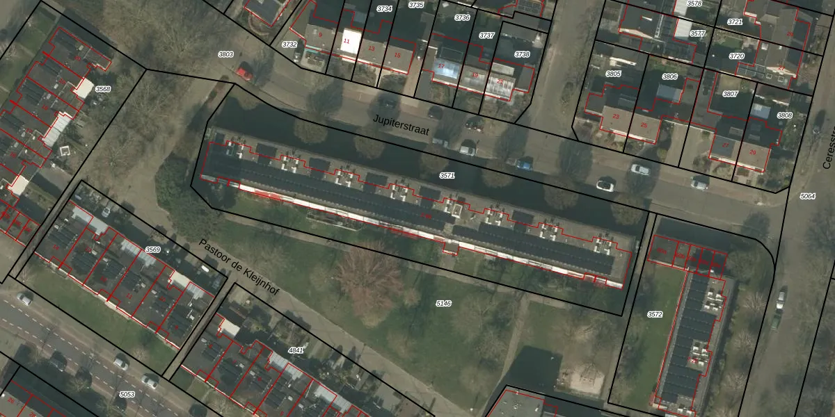 Het perceel waarop Jupiterstraat 30 staat heeft een oppervlakte van 2830 m². Dit is een zeer groot perceel. De perceeloppervlakte wordt geregistreerd door het Kadaster. Gedetailleerde informatie over de maten van dit perceel kunt u vinden in het rapport Kadastrale kaart met maatvoering van Jupiterstraat 30.