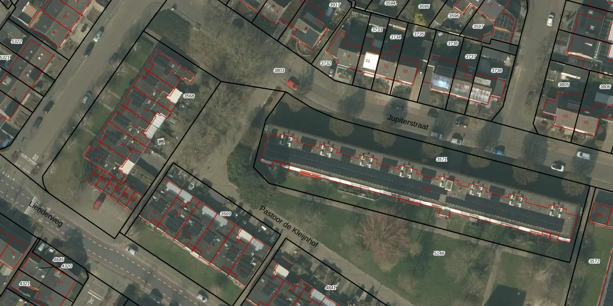 Het perceel waarop Jupiterstraat 8 staat heeft een oppervlakte van 2830 m². Dit is een zeer groot perceel. De perceeloppervlakte wordt geregistreerd door het Kadaster. Gedetailleerde informatie over de maten van dit perceel kunt u vinden in het rapport Kadastrale kaart met maatvoering van Jupiterstraat 8.