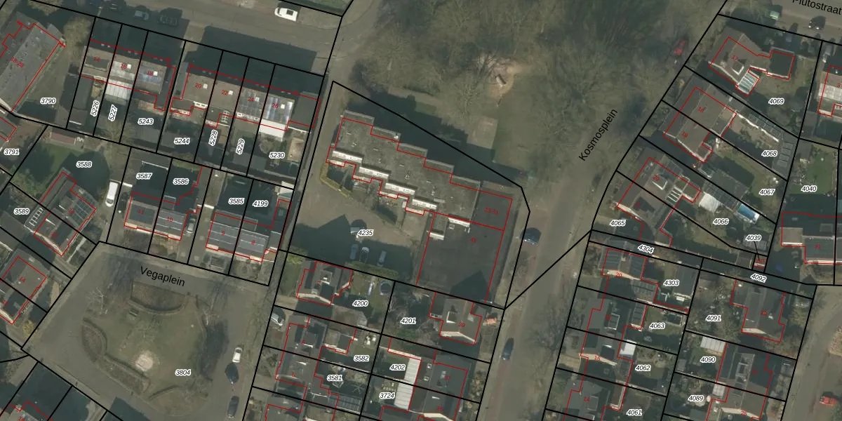 Het perceel waarop Kosmosplein 25 staat heeft een oppervlakte van 1882 m². Dit is een zeer groot perceel. De perceeloppervlakte wordt geregistreerd door het Kadaster. Gedetailleerde informatie over de maten van dit perceel kunt u vinden in het rapport Kadastrale kaart met maatvoering van Kosmosplein 25.
