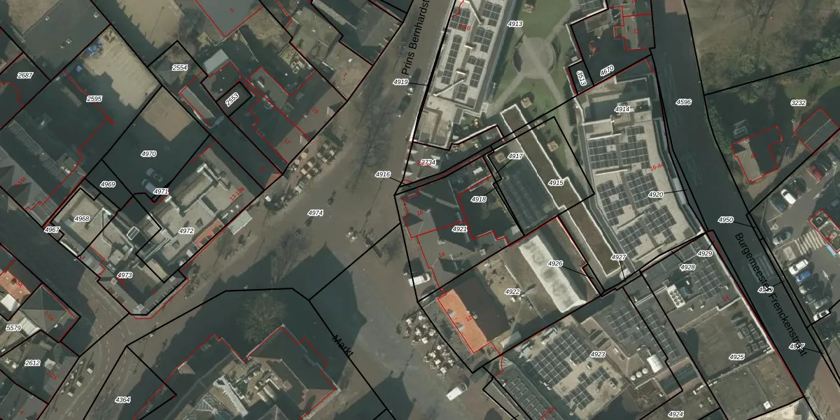 Het perceel waarop Markt 16 staat heeft een oppervlakte van 575 m². Dit is een groot perceel. De perceeloppervlakte wordt geregistreerd door het Kadaster. Gedetailleerde informatie over de maten van dit perceel kunt u vinden in het rapport Kadastrale kaart met maatvoering van Markt 16.