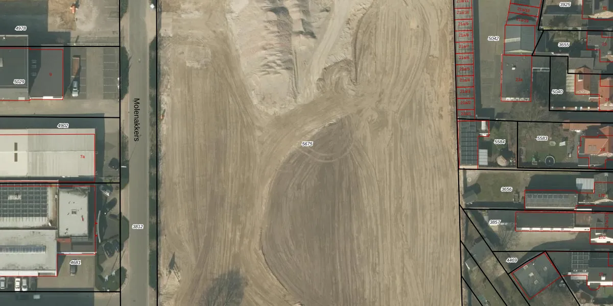 Het perceel waarop Molenakkers 2-x staat heeft een oppervlakte van 1,3 ha. Dit is een zeer groot perceel. De perceeloppervlakte wordt geregistreerd door het Kadaster. Gedetailleerde informatie over de maten van dit perceel kunt u vinden in het rapport Kadastrale kaart met maatvoering van Molenakkers 2-x.